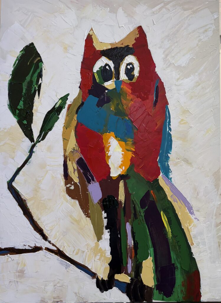 June 20, 2020 In Aya Zein – The owl and the two leaves MEDIUM: Acrylic on canvas DIMENSIONS: 120×90 cm YEAR: 2025 Back Tags: Aya Zein